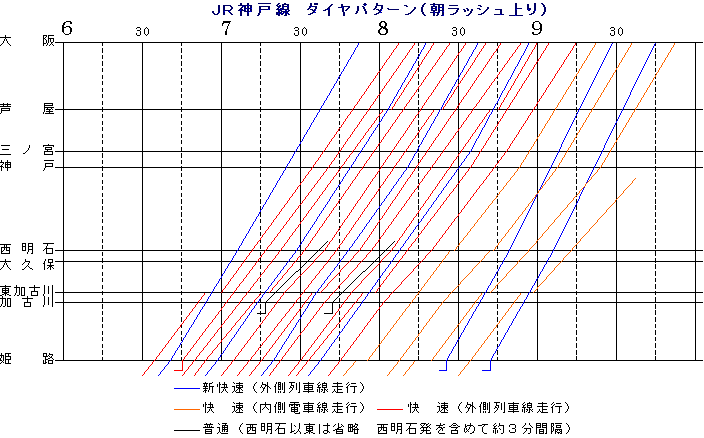 普通は大阪〜神戸で平均7.5分間隔,神戸〜西明石で15分間隔。