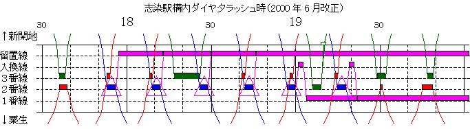 志染駅は次の図に示すように,単線区間の中で2面3線に新開地寄りに留置線が配置されている。各線の基本的な使用法は次のとおりである。