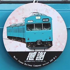 2001年7月1日の和田岬線電化以来22年にわたって同線専属で運用されてきた103系R1編成が2023年3月18日のダイヤ改正で勇退することとなり, 前後で異なる2種類のヘッドマークが2月27日から最終日3月18日まで掲出されました。
